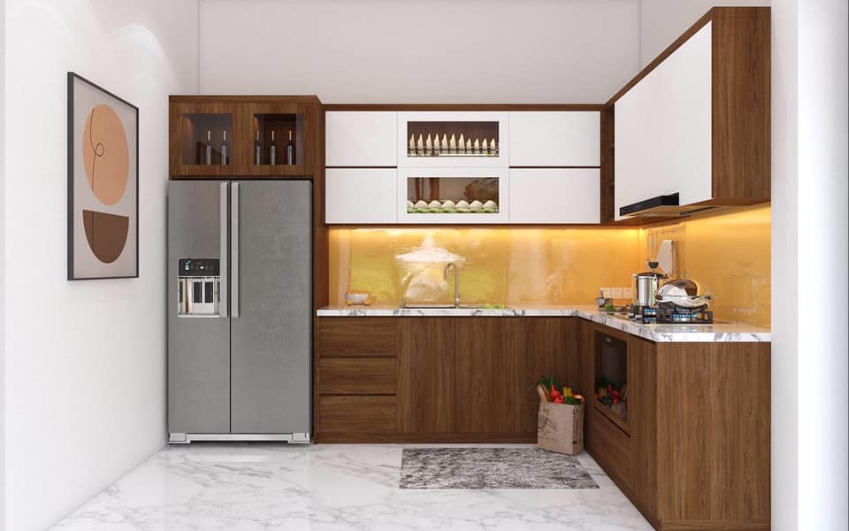 - Với thiết kế nằm trong một góc của ngôi nhà, tạo ra một khoảng không gian mở ở phía trước.Tủ bếp hình chữ L sẽ tạo ra một tam giác: bồn rửa - bếp nấu - tủ lạnh, nhờ đó mà sẽ dễ dàng di chuyển trong quá trình nấu nướng.