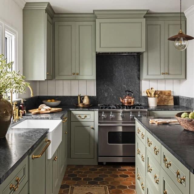 - Đá tự nhiên kim sa đen: Bề mặt nhẵn, không thấm nước, không bị xước, dễ dàng lau dọn cùng với độ bền cứng khá tốt và giá thành vừa phải thì đây là loại đá đang sử dụng nhiều nhất để làm mặt bàn bếp. Nhược điểm của loại đá này là sẽ xuất hiện các vết nứt tại điểm khoan cắt sau một thời gian sử dụng.